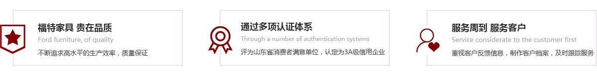 公司全体员工紧紧牢记“福特家具,贵在品质”的承诺,本着“以质量求生存,以信誉求发展”、“诚实守信”的企业理念,力争“创名优企业,铸优质品牌”,在全公司上下兢兢业业、认认真真,严格要求自己,不断追求自已,不断追求更高水平的生产效率,我公司注重质量管理,先后通过了国际质量管理体系ISO9001认证、国际环境管理体系14001认证、职业健康安全管理体系OHSAS18001认证,公司注重品牌建设,先后注册了“世纪福特”、“杰福特”、“伯爵”三个系列商标,公司连续多年被烟台市工商局授于“市级守合同重信用企业”称号,连续被山东省工商局授于“省级守合同重信用企业”称号,被山东省企业信用与社会责任协会评为“优秀企业会员”称号,连续被烟台市消费者协会评为消费者满意单位,连续被山东省消费者协会评为第八届、第九届山东省消费者满意单位,被认定为AAA级信用企业,随着社会环保意识的不断提高,公司2014年4月顺利通过了中国环境标志产品认证,2015年8月顺利通过了中国质量认证中心CQC环保产品认证,并于2015年12月被评为“山东省著名商标”荣誉称号。